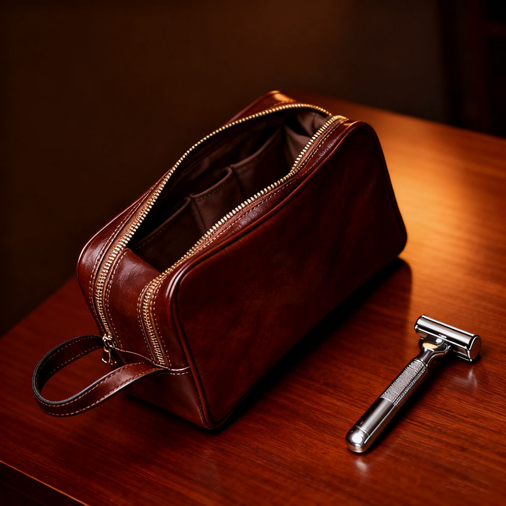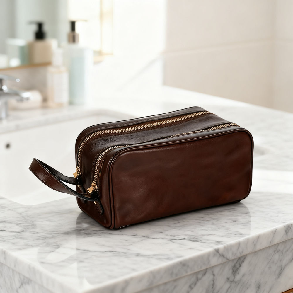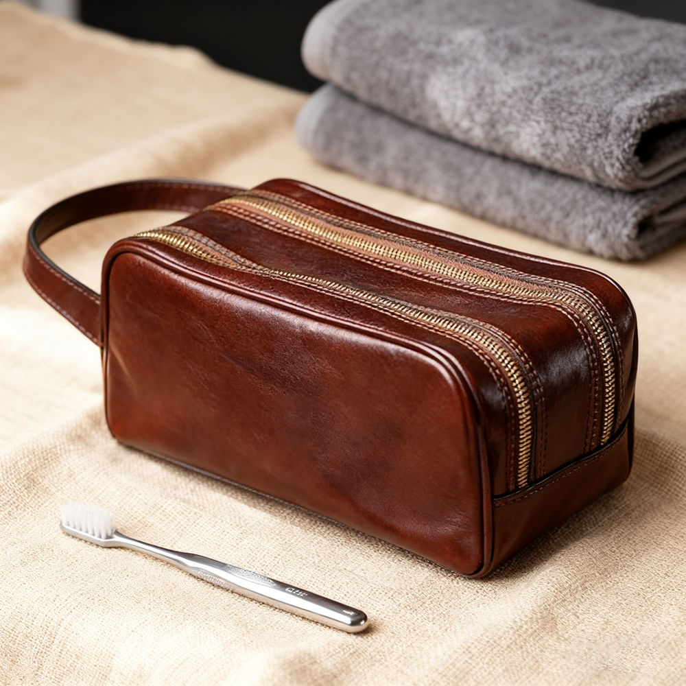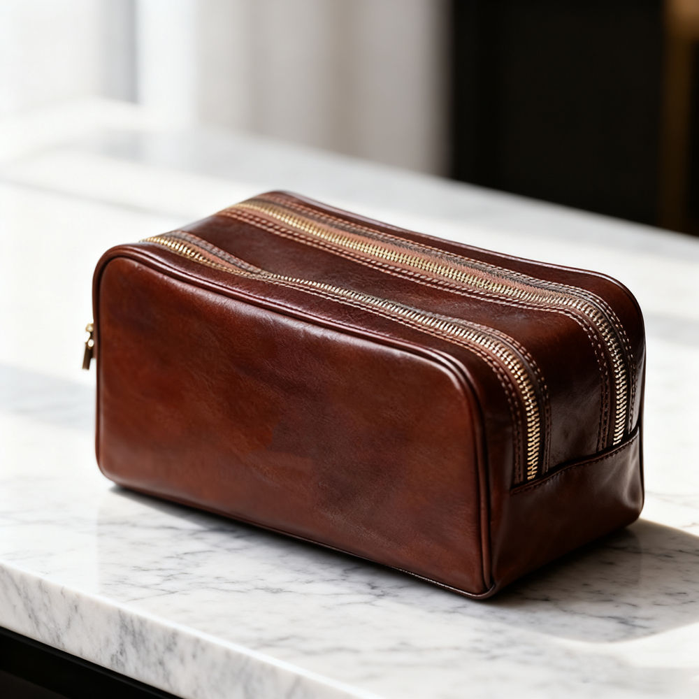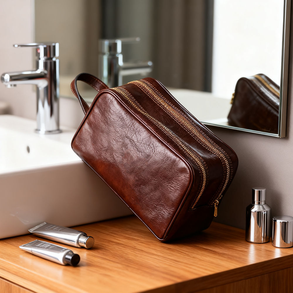 Crafted from genuine leather, the bag features a smooth surface, durable structure, and reinforced stitching for long-term use. The spacious interior easily stores grooming essentials such as toiletries, shaving kits, and personal care items, while secure zipper closures ensure organized storage during travel.